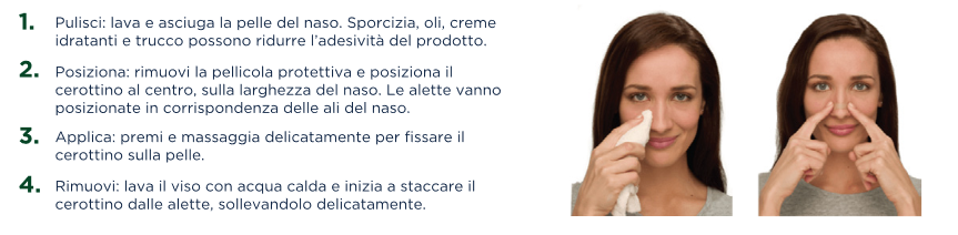 L'utilizzo dei cerottini nasali è estremamente semplice. Prima di utilizzarli, si raccomanda un'adeguata pulizia del viso per favorire l'adesione del collante del cerottino al naso. Per un corretto utilizzo dei cerotti nasali consiglia di seguire le indicazioni riportate nell'immagine di seguito.